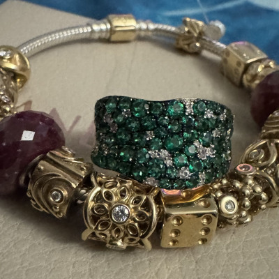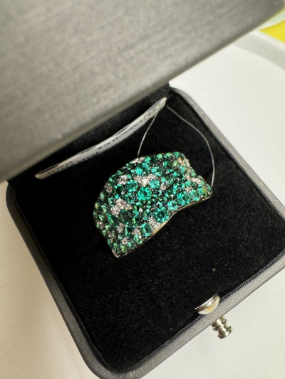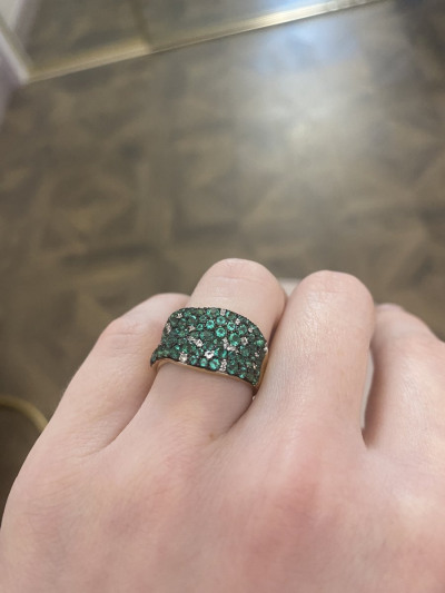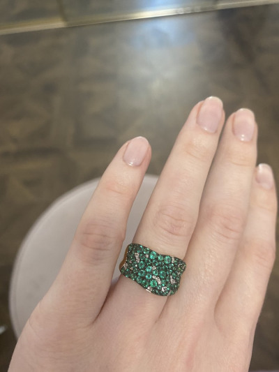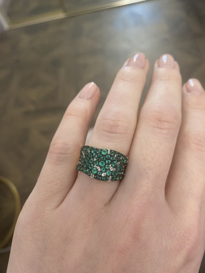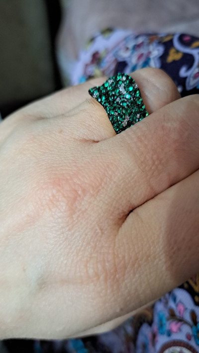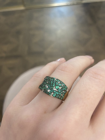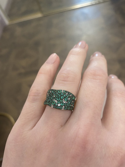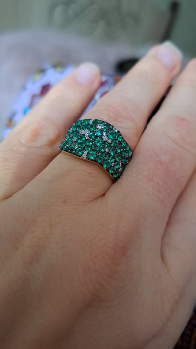 Очень давно за ним охотилась, долго ждала подходящий размер и вот оно мое!!! Довольна очень! Оно сверкает, шикарно выглядит, эффектное, глаз не оторвать! Цена конечно кусается, учитывая, что изумруды гидротермальные. Оно объемное, но носить на безымянном пальце удобно.