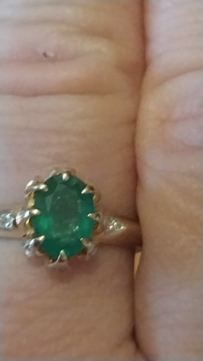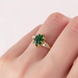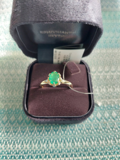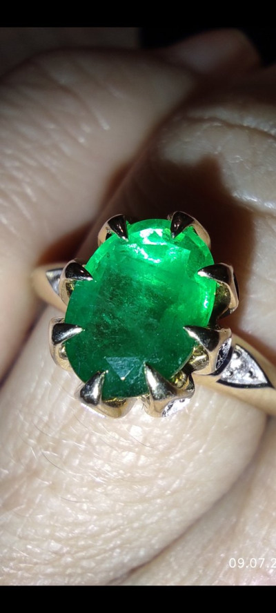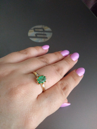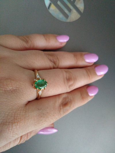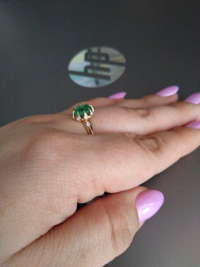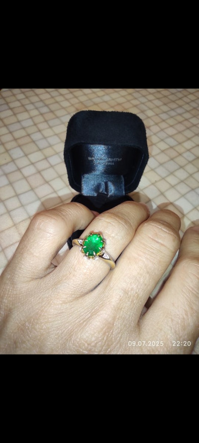 Отличные кольцо, изумруд в один карат. Не понятно почему нет сертификата. На ручке смотрится аккуратно, не задевает.
