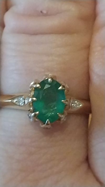 Чудесное кольцо, крупный изумруд 1.086 карат, цвет и прозрачной в меру. Видеообзор также разместила для наглядности. + 5 фото здесь. В окружении бриллиантов смотрится интересно. Мне очень нравится! Месяца три выбирала из разных вариантов и по интересной цене. В этом кольце выбрала лучший для меня красивый изумруд - очень хотела крупный, с притягательным и загадочным цветом (не бледный и не мутный). Естественные вкрапления и трещинки присутствуют (творец же природа), но минимально, без мутности и молочности. Посадка камня прочная восемь карпанов держат камень как корону. Шинка кольца полая, но прочная. Камень подсвечивается хорошо со всех сторон.