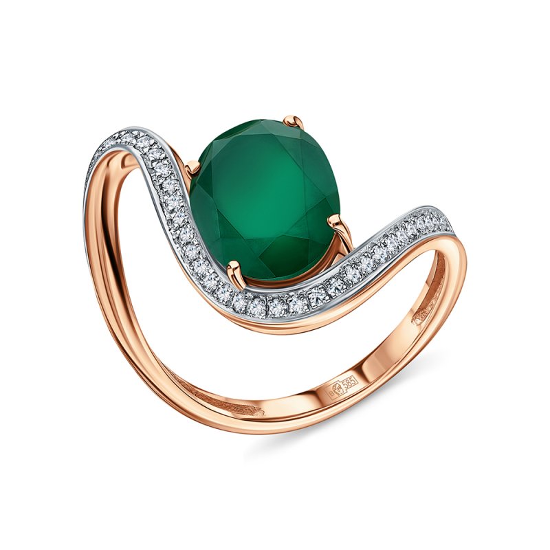 Кольцо с 10 бриллиантами природными, 0.04 карат, огранка круг 17 граней, цвет 2, чистота 2, тип огранки А; 10 изумрудами природными, 0.18 карат, цвет 3, чистота 3, тип огранки В; 20 изумрудами природными, 0.18 карат, цвет 3, чистота 3, тип огранки В; 1 агатом зеленым природным; Розовое золото 585 пробы.